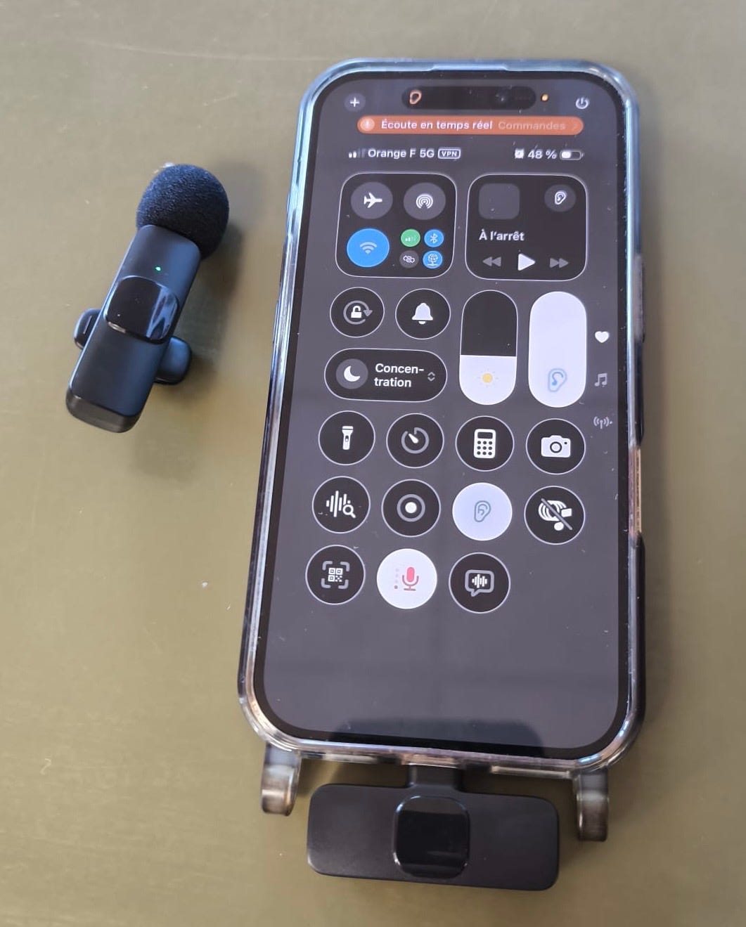 Je me suis donc achetée des microphones. Je donne un microphone à la personne qui parle et je branche le récepteur sur mon téléphone. En activant la fonctionnalité “Ecoute en temps réel” sur mon IPhone, je peux entendre à quelques mètres la personne qui parle grâce au Bluetooth sans les bruits environnants qui m’entourent.